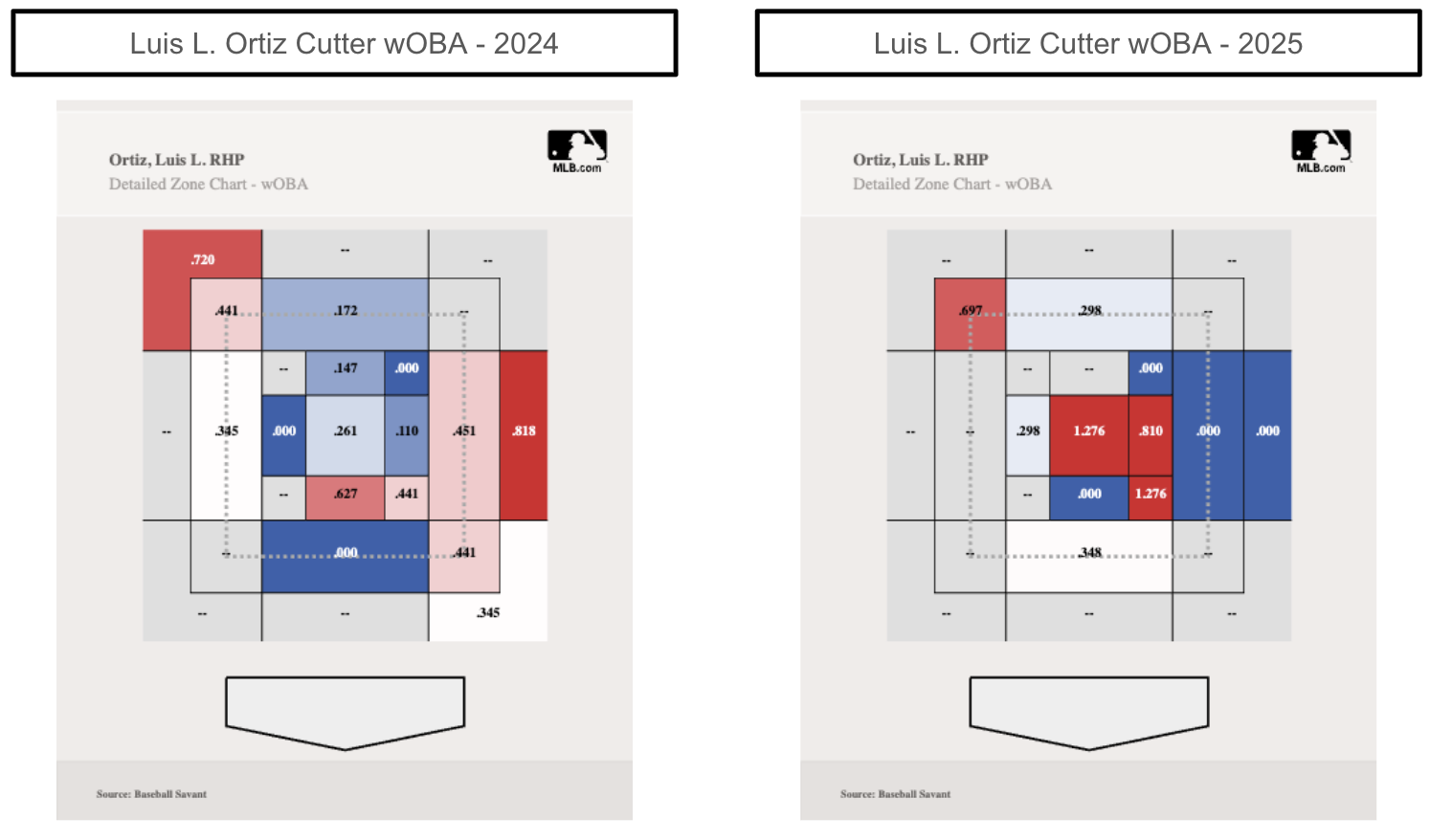 Ortiz's cutter has been brutal but could be worse against right-handed hitters (.476 wOBA, .607 xwOBA). However, the cutter has been better yet still rough against lefties (.376 wOBA, .443 xwOBA). In Ortiz's recent outings, we saw his cutters and sliders in the heart of the zone.