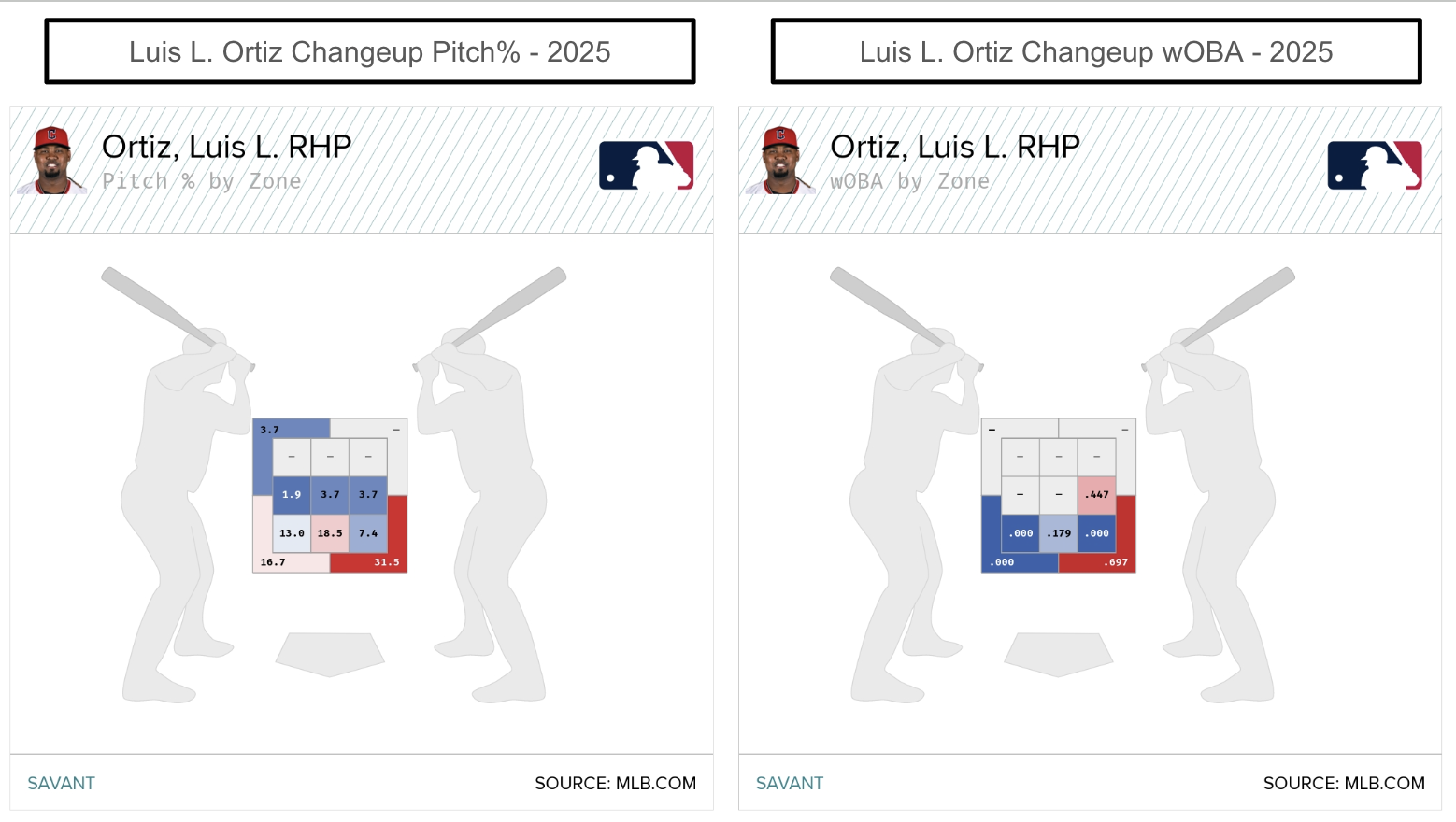 Pitchers with lower arm angles (like Ortiz) can struggle against left-handed hitters with the east-to-west arsenal. However, Ortiz's changeup has been sneaky good, allowing a .133 wOBA (.210 xwOBA) in 2025 versus lefties, as a pitch he uses often (17.9 percent). The changeup shape is different, reaching a career high in vertical movement (32.7 inches), leading to a slightly above-average profile.