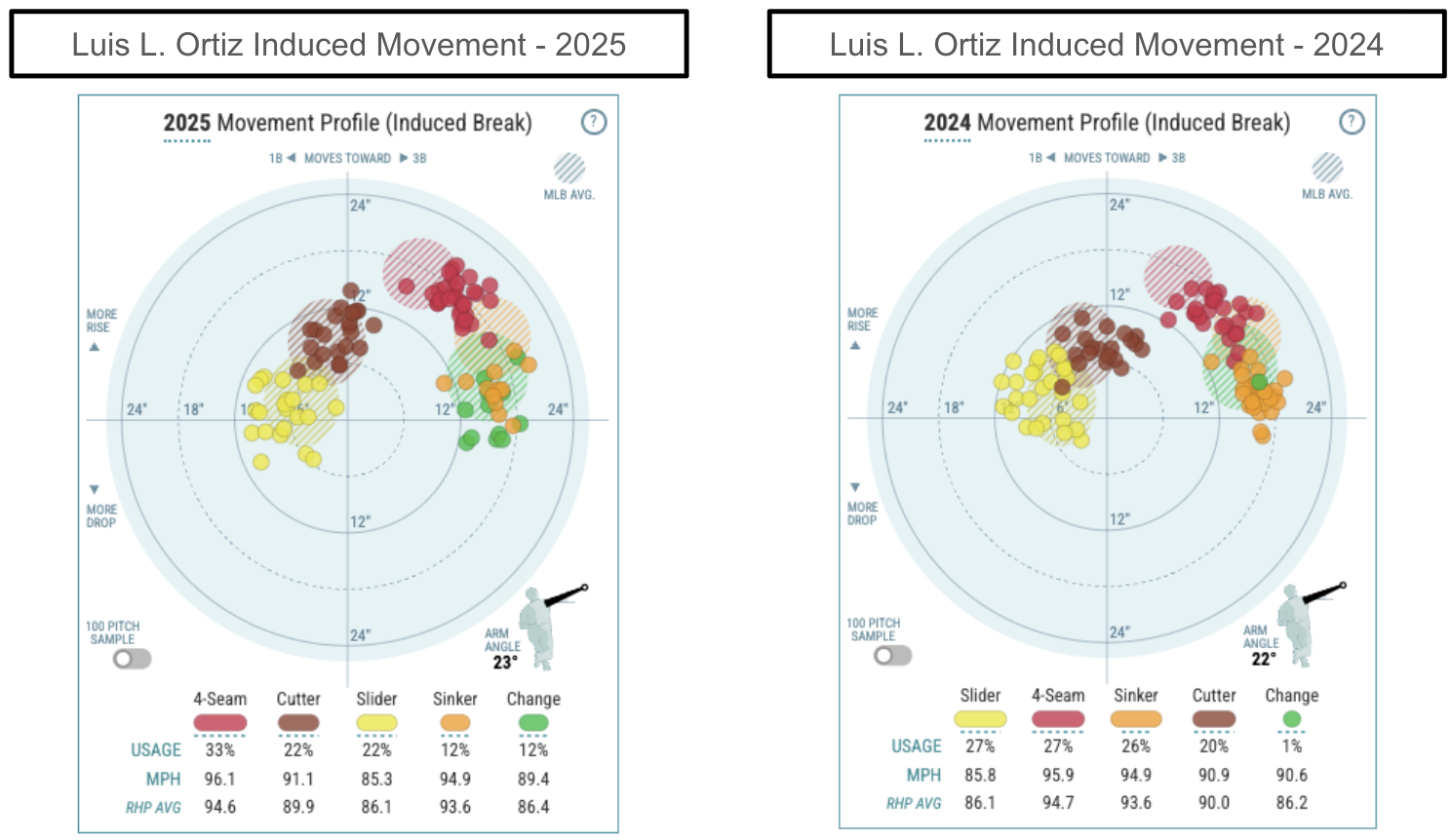 Ortiz's slider has generated a SwK over four percentage points higher than his career average. That aligns with Ortiz's slider dropping over two inches more in 2025 with a similar velocity and induced movement profile. We've seen his slider vertical movement fluctuate throughout his career, with 37 inches in 2025, like 2023.