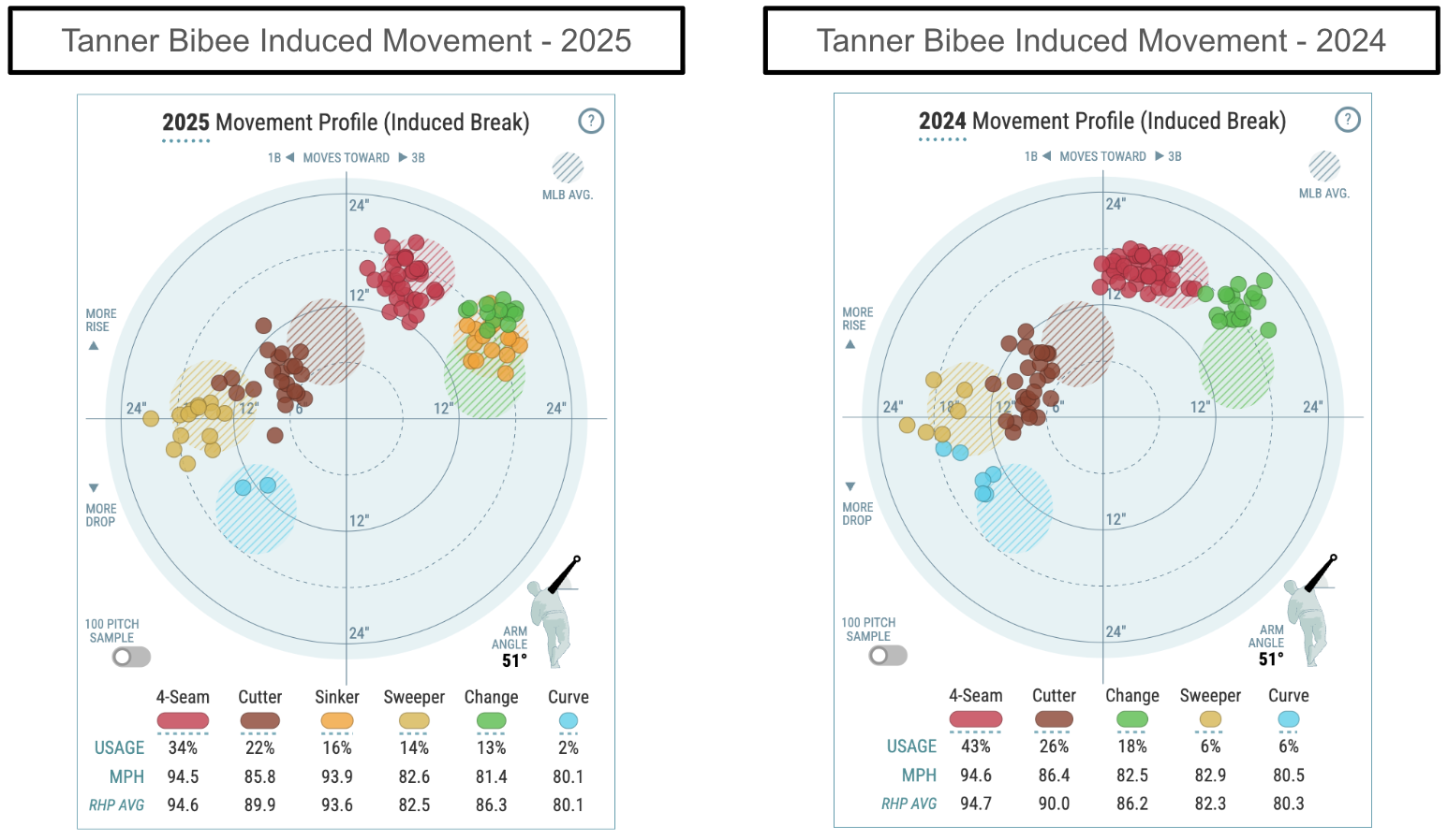 The induced pitch movement from 2025 versus 2023 shows us the added depth for the changeup and how it fits into his arsenal, with most of the focus on the sliders and cutters.
