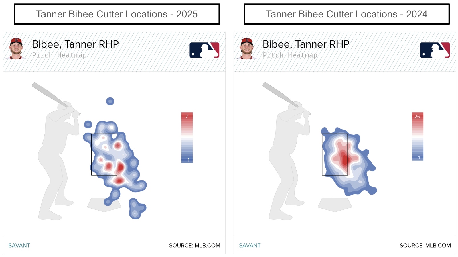 The results against Bibee's cutter have been better versus lefties (.265 wOBA, .372 xwOBA), and we saw him lower the usage to 15.2 percent (2025), down from 20.3 percent (2024). The arsenal overall against left-handed hitters raises the most concern because of the lower whiff rates and contact quality.