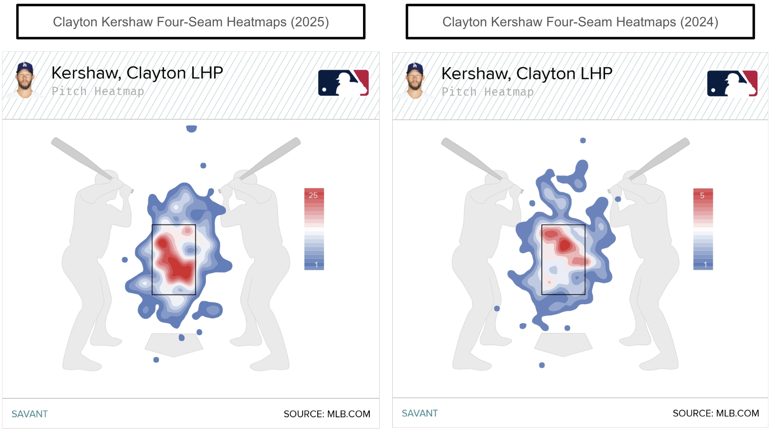 Like the slider, Kershaw's four-seam has been thrown too often in the heart of the zone. That suggests Kershaw's four-seam locations have contributed to the challenges in 2025. Kershaw has been throwing his four-seam in the heart of the zone 12.6 percent of the time, up from 9.1 percent (2024), yet similar to 2023 (11.3 percent) and 2022 (13.2 percent).