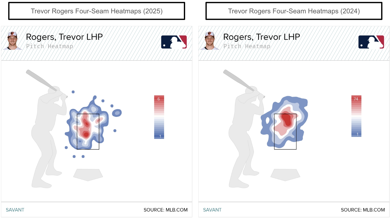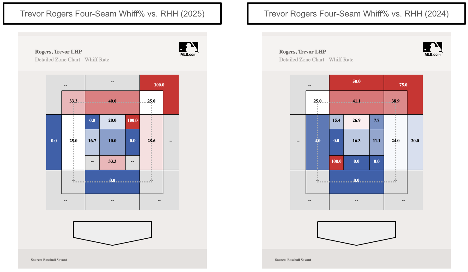 For context, Rogers throws his four-seam 25 percent of the time in the upper parts of the zone in 2025 against right-handed hitters. Based on the heatmaps, Rogers was throwing his four-seamer in the upper third of the zone over the past two seasons. He has been locating the four-seam more in the heart of the zone, yet slightly toward the inside portion of the plate for right-handed hitters.