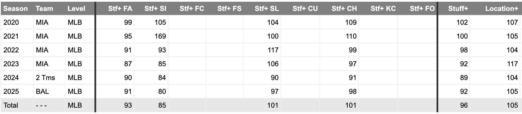 We've seen a slight fluctuation in his horizontal release point, with it moving 1.5-2 inches closer to his midline. That coincides with Baz losing over two inches of extension, possibly hinting at grip changes, or it's a fluky difference in 2025.