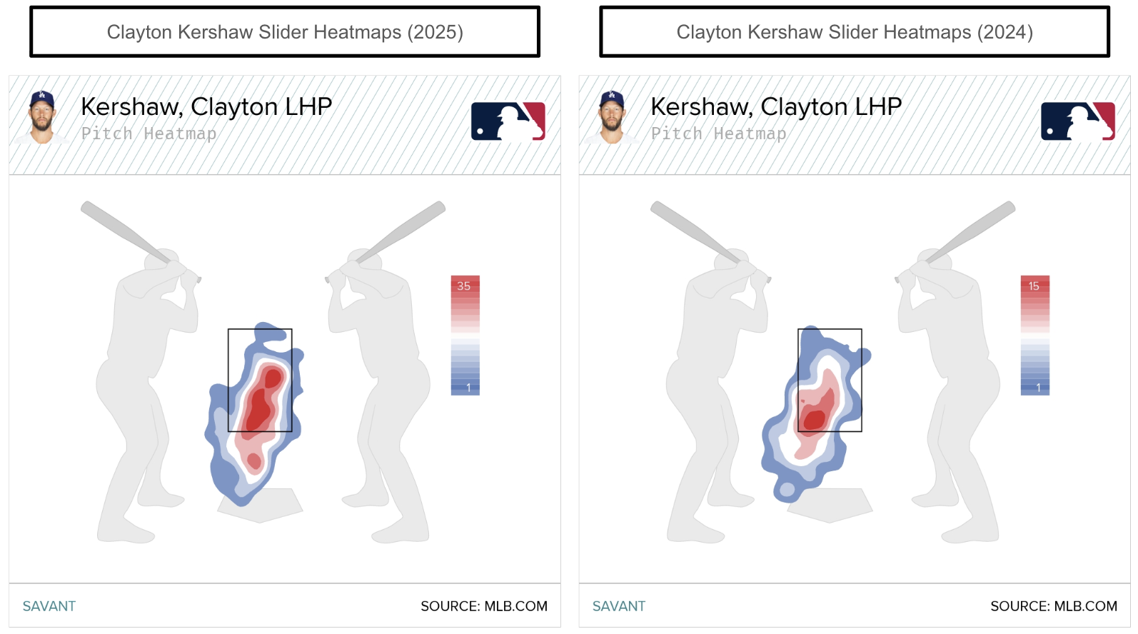 For context, Kershaw's slider allowed a .366 wOBA (.330 xwOBA) in 2024, with the 2023 (.267 wOBA, .285 xwOBA) and 2022 (.246 wOBA, .233 xwOBA) being significantly better against right-handers. So, what changed? Kershaw's slider velocity, vertical, and horizontal movement profiles haven't shifted much over the past few seasons. One would speculate on Kershaw's slider locations.