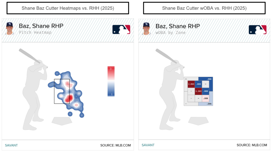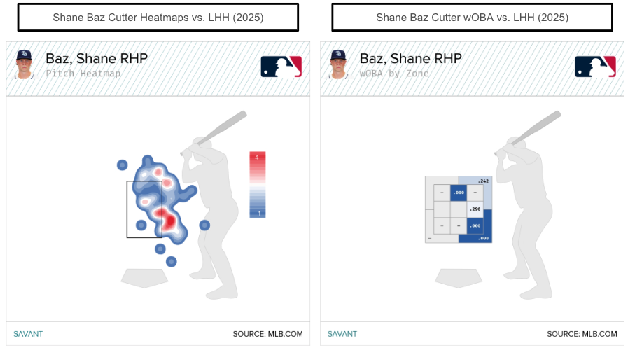That's notable because Baz's four-seam hasn't been great, with a .356 wOBA (.364 xwOBA) in 2025, worse than his 2024 results (.321 wOBA, .315 xwOBA). Baz has been mixing in cutters against right-handed (7 percent) and left-handed (7.9 percent) hitters. In the small sample, it's been his best offering in 2025.