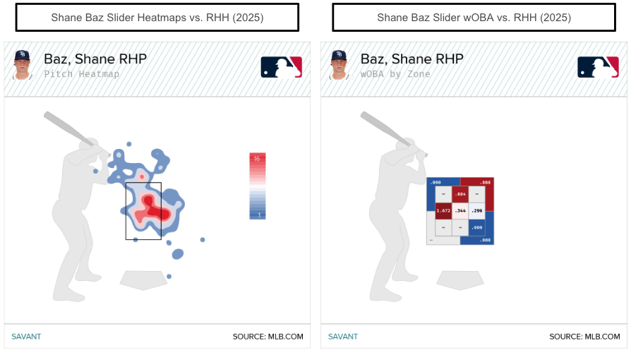 When Baz throws his slider in the zone in 2025, it results in a .708 wOBA (.638 xwOBA) against right-handed hitters. That's much worse than his results in 2024, with the slider allowing a .267 wOBA (.288 xwOBA) when thrown in the zone.