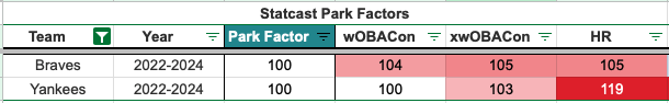 ATC projects Fried to post a similar season to 2024, making him a potential value around pick 100. The Braves and Yankees ballpark have similar Statcast Park Factors for right-handed hitters (100). However, the Yankees' stadium is ridiculously favorable for righties (119 HR Park Factor) compared to the Braves (105 HR Park Factor).