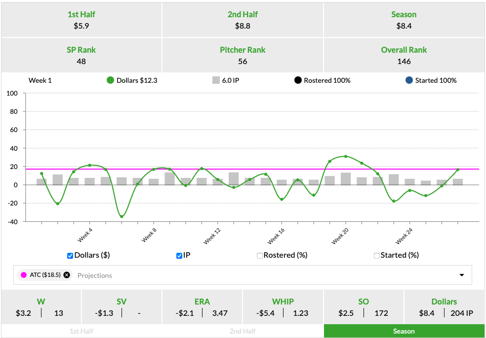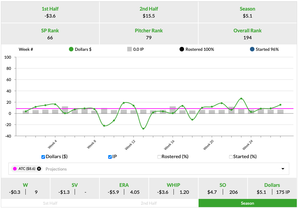 Kikuchi crushed it in August and September, with a 2.70 ERA, 0.93 WHIP, 25.9 percent strikeout minus walk rate, and a 13.7 percent swinging strike rate in 60 innings. He earned $15.5 in the second half compared to $-3.6 in the first half in 12-team leagues. That aligns with the success in real-life and fantasy leagues, as seen below.