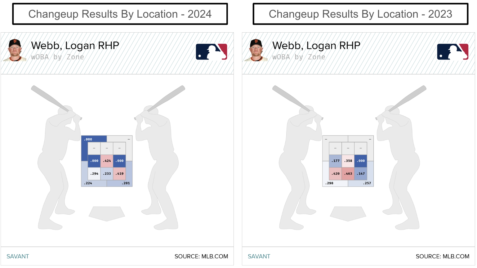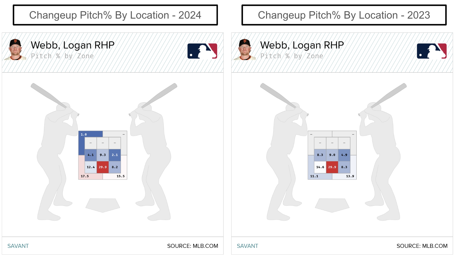 Webb lowered the zone rate on the changeup in 2024 to a career-low 33.2 percent, leading to mixed results. That's evident by hitters chasing the changeup out of the zone 52 percent of the time (career best), though it led to a career-low swinging strike rate.