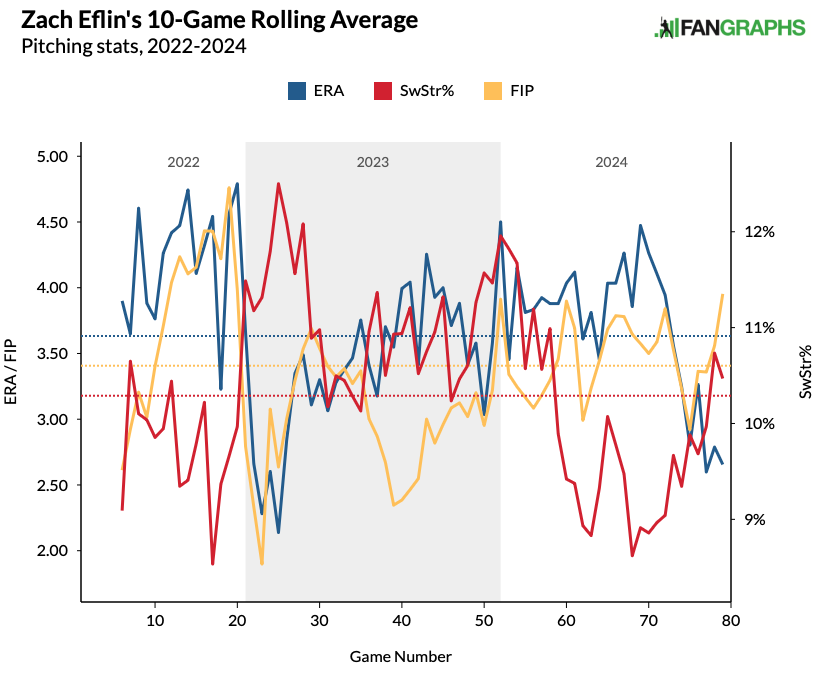 Eflin's control is near-elite, with a 32 percent ball rate in 2024 after 31 percent in 2023. That gives him a floor, but Eflin's swinging strike rates have been mediocre. His curveball still headlines his arsenal, with a 17 percent swinging strike rate, similar to his career average (16.6 percent). For context, that's over 3-4 percentage points above the league average via curveball swinging strike rate.