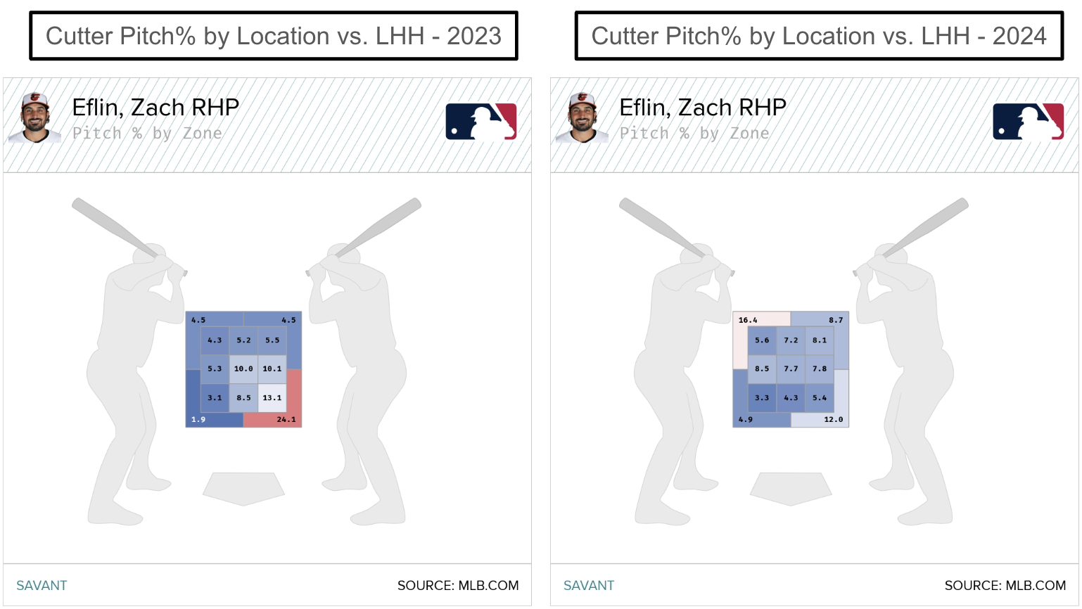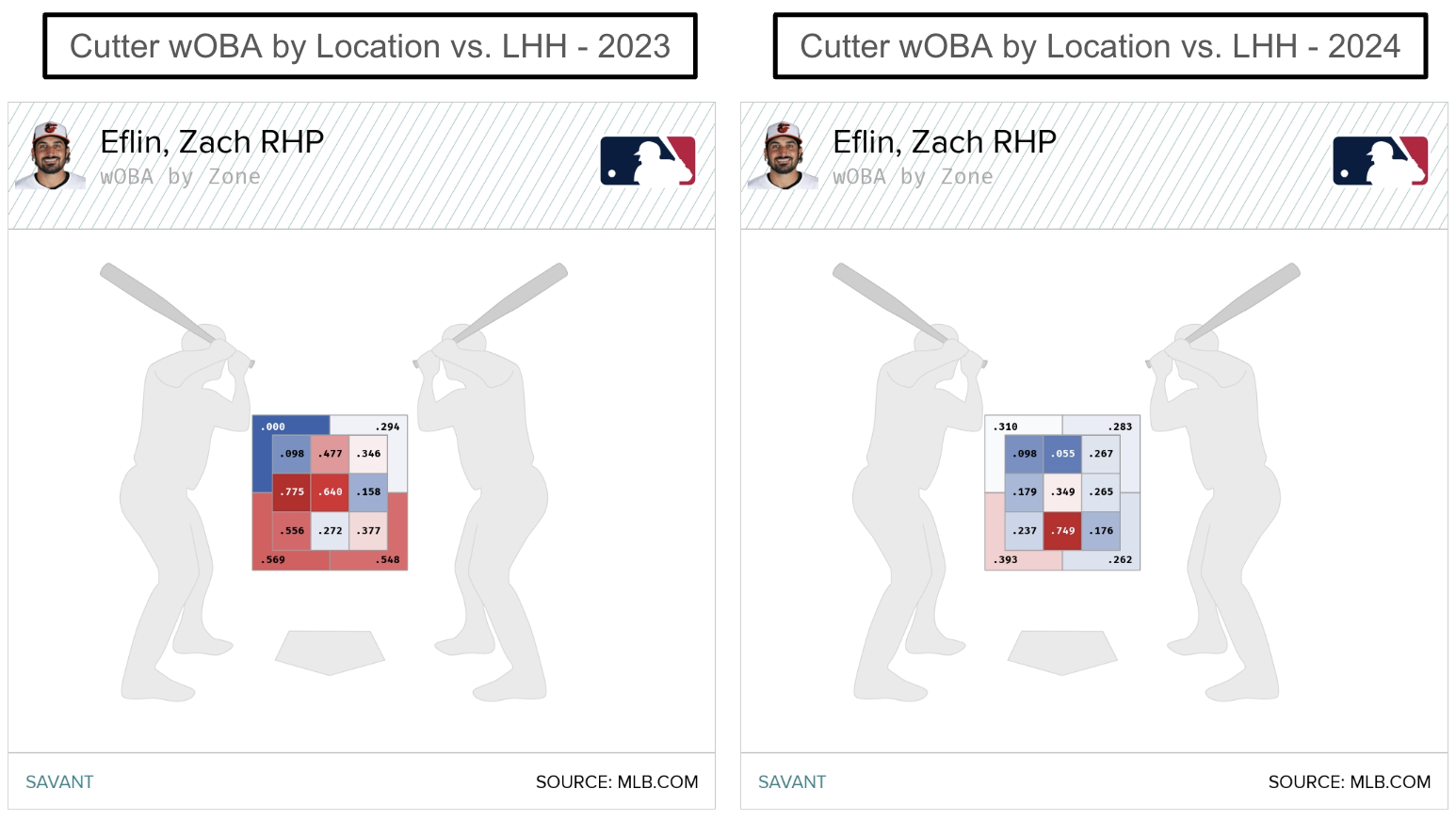 Meanwhile, Eflin relies on the cutter the most against lefties (37.1 percent), with improved results in 2024. Last season, Eflin's cutter allowed a .242 wOBA (.279 xwOBA) against lefties coming off brutal outcomes in 2023 (.394 wOBA, .364 xwOBA).