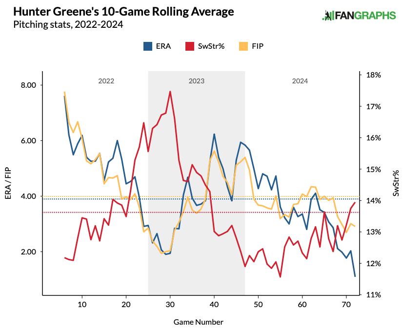 Thankfully, Greene's skills remained above average and consistent, with an 18 percent strikeout minus walk rate and 13.8 percent swinging strike rate. He saw his home runs drop to a six percent HR/FB in 2024 compared to 12 percent in his career.