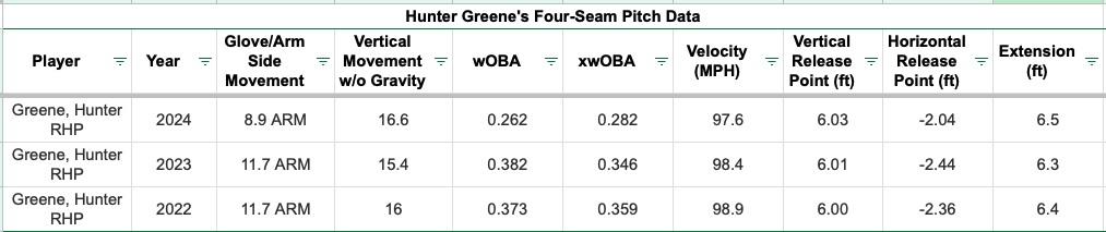 We want to examine the movement profiles when the results improve or change. Greene's induced vertical break on the four-seamer improved near the above-average range while losing two to three inches of arm-side fade. Unsurprisingly, Greene had more extension and a horizontal release point closer to the body's midline, aligning with the four-seamer's movement profile changes.