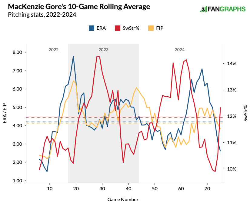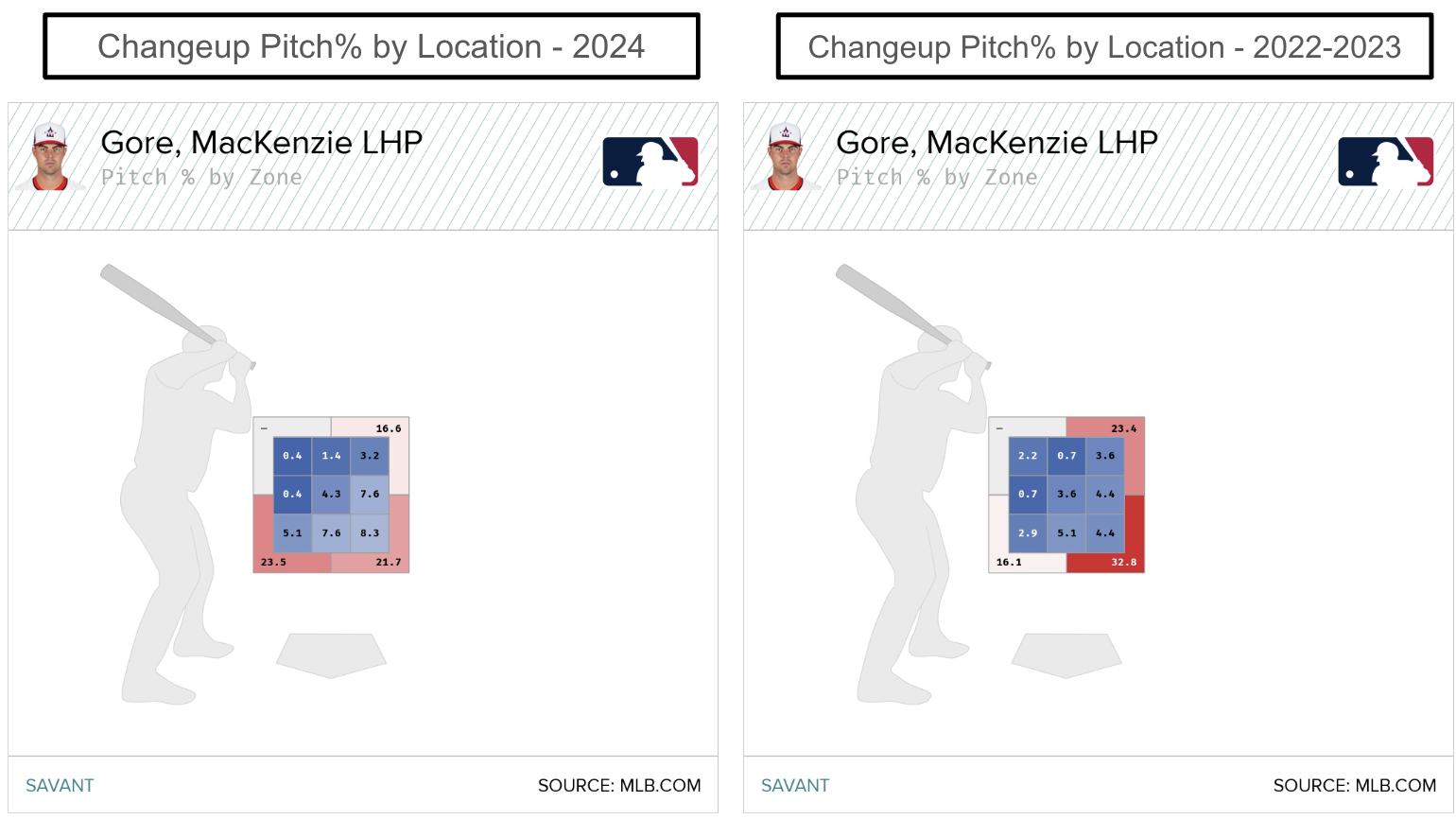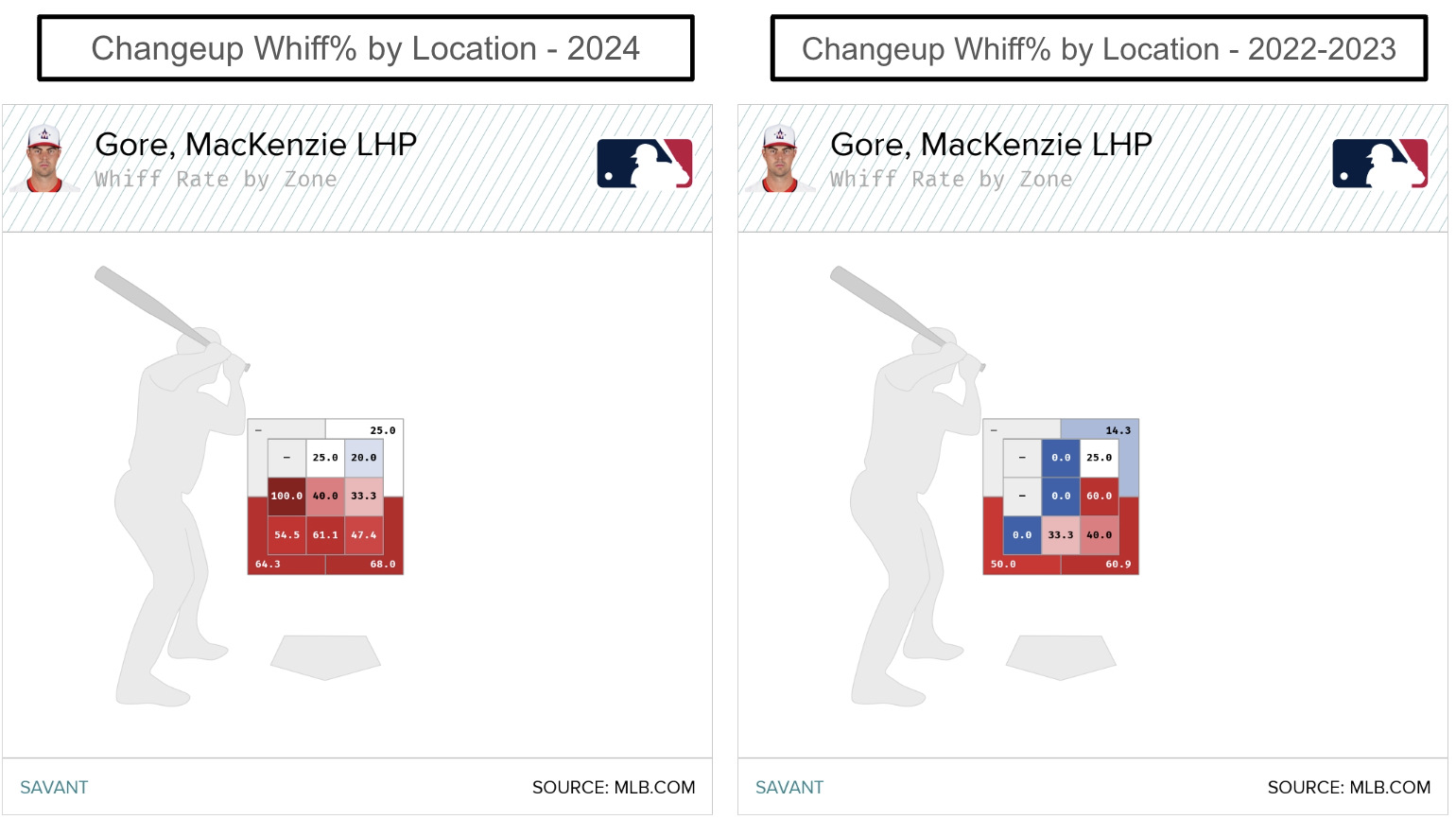 However, Gore threw the changeup more often at 12.4 percent, a career-high rate versus right-handed hitters. Gore's swinging strike rate jumped in 2024 to 22.4 percent, but the batted ball results were awful, evidenced by the .344 wOBA (.288 xwOBA).