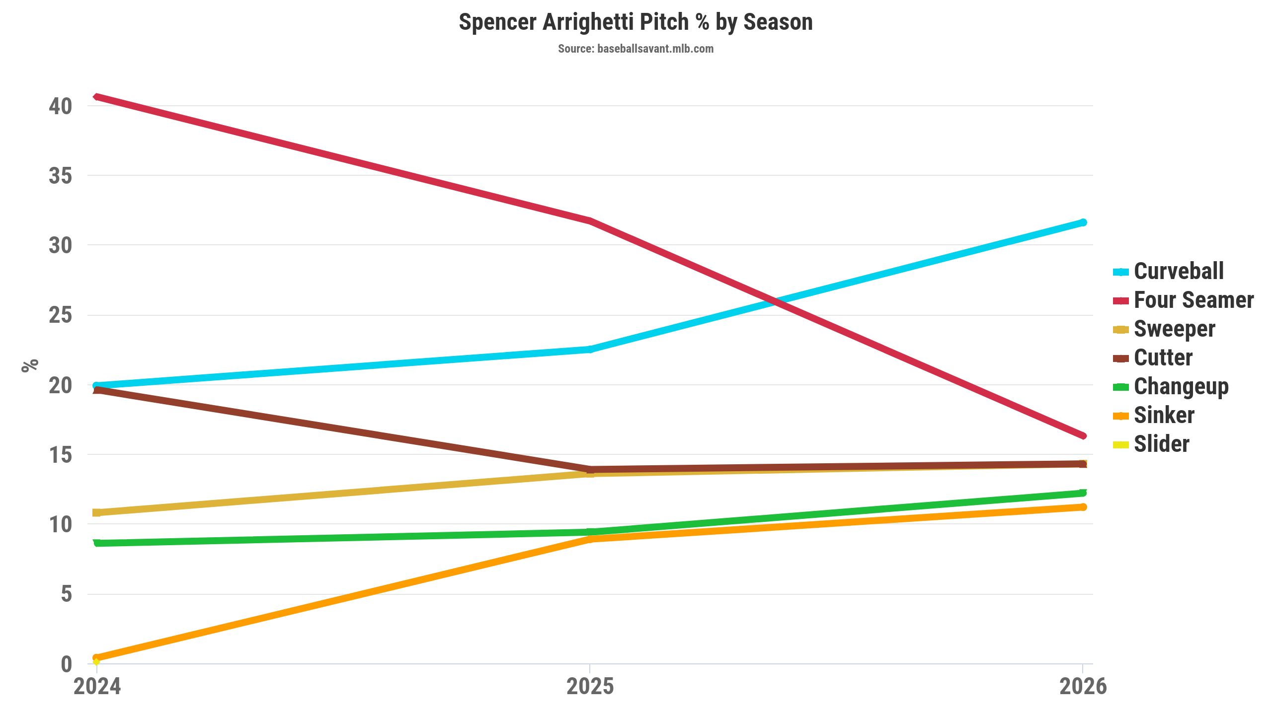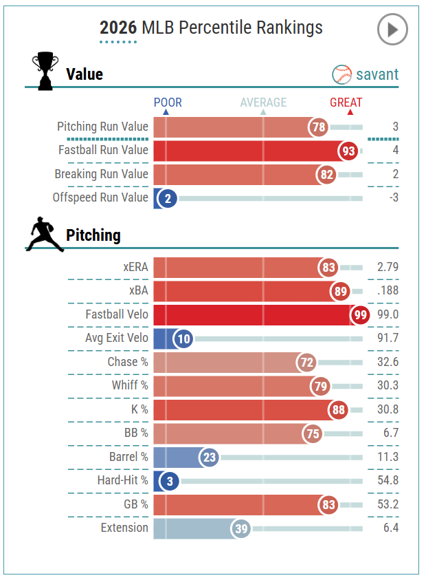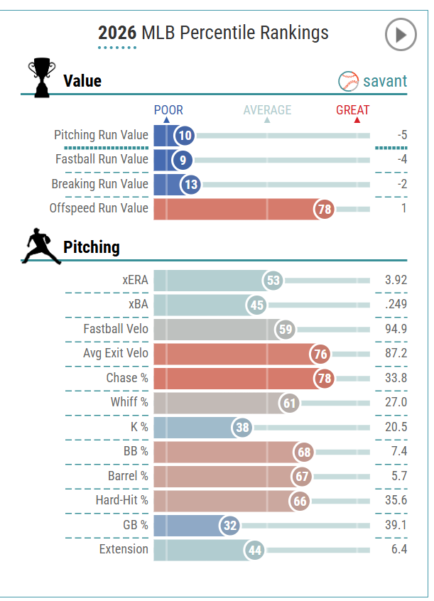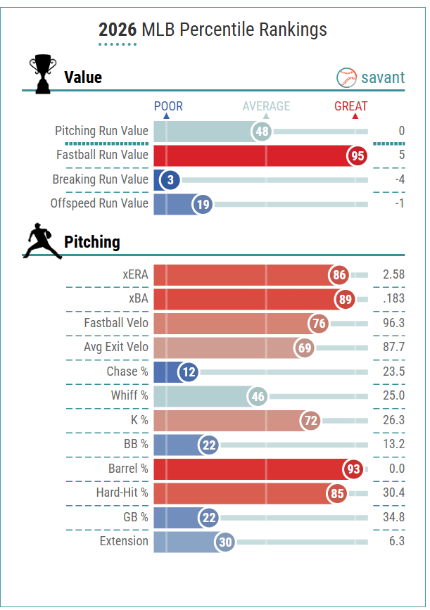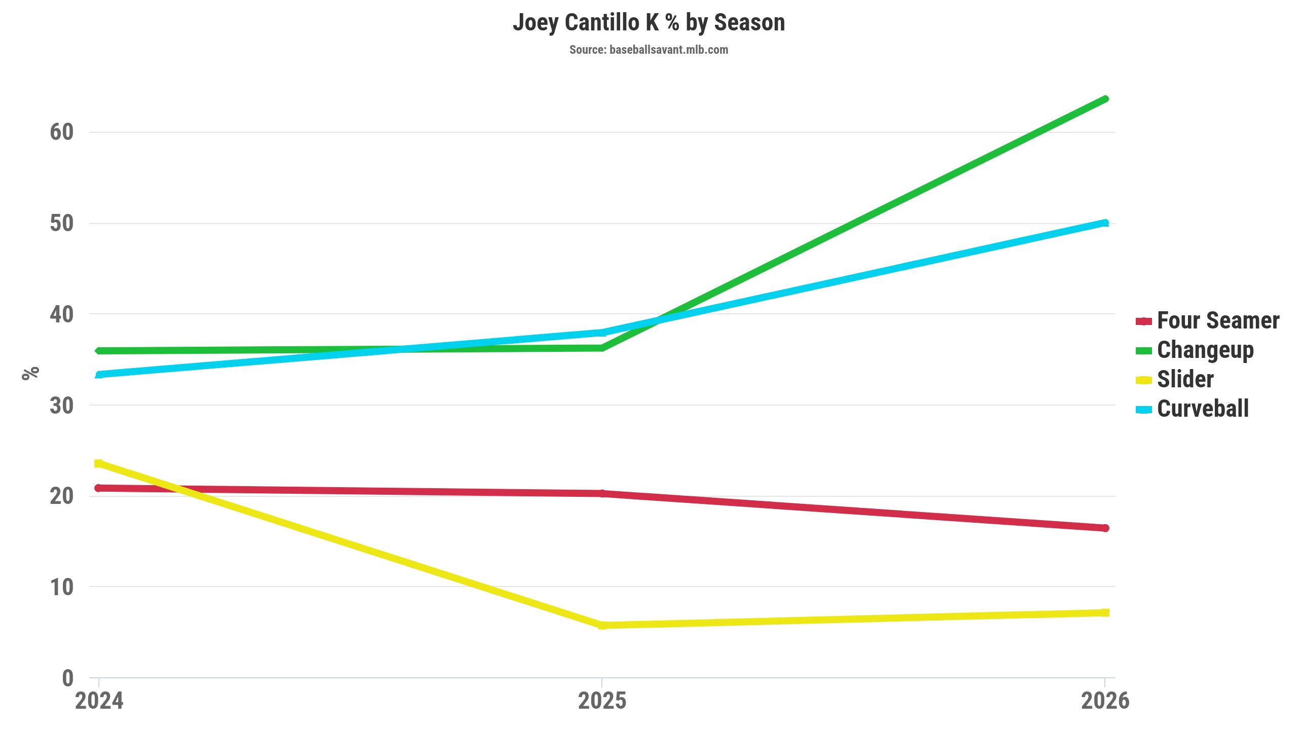 You can see in the chart below that Cantillo is getting his strikeouts from his changeup and curveball, which is a great sign that his pitch mix is working well and has adapted from his former two-pitch mix. I am a big fan of Cantillo in 2026.