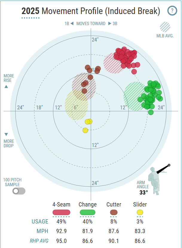 The changeup has a ton of horizontal movement with nearly 19 inches of arm-side run. The two pitches look identical coming out of his hand, but are 10-12 mph different in velocity, and ideal separation to keep hitters off balance.