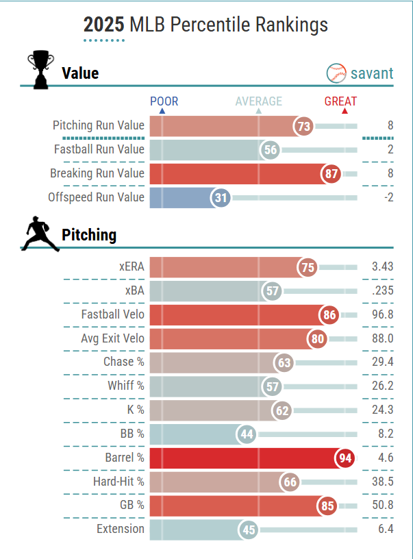 The fastball wasn't overpowering at 92-93 mph, but had an elite Location+ rating of 112 and was rarely hit hard. Despite the lack of velocity, he had a 29% whiff rate on his fastball, comparable to Paul Skenes for context.
