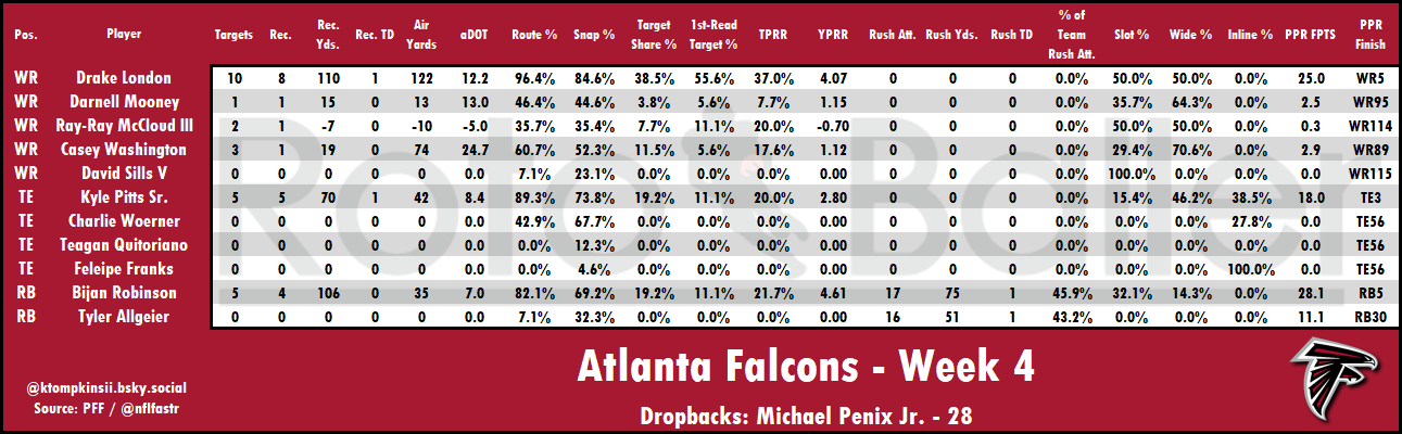 Shaking off some of the rust from the last couple of weeks, Drake London (8-110-1) returned to form with an awesome game where he led the way with 10 targets. Darnell Mooney hurt his hamstring, and it’s a good thing the Falcons are on bye, because he certainly would miss a Week 5 game if the Falcons played one.