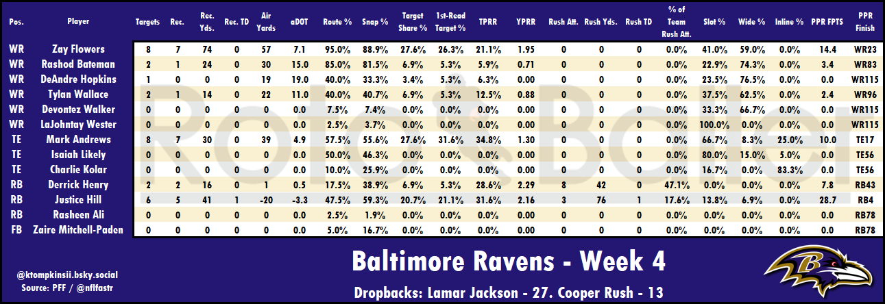 For Week 4, the Ravens got behind early here, at points trailing by two scores in the second quarter and well into the third. From then on, it was Justice Hill (3-76-1 rushing; 5-41-1 receiving) seeing quite a bit of work with a touchdown at the beginning of the game and then a 71-yard rushing score in garbage time. Derrick Henry (8-42 rushing; 2-16 receiving) was effectively game-scripted out here.