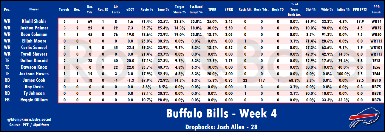Only two Bills players ran more than 70 percent of routes: Keon Coleman (3-45) and Khalil Shakir (5-69-1). Coleman’s is miles away from a massive Week 1 game at this point, as that’s a clear anomaly. Shakir has the best chance of returning consistent value with his role as the short-area YAC compiler that acts as a team’s run game too. It’s a great role for PPR formats, and it’s what propped up Shakir’s fantasy value last season.