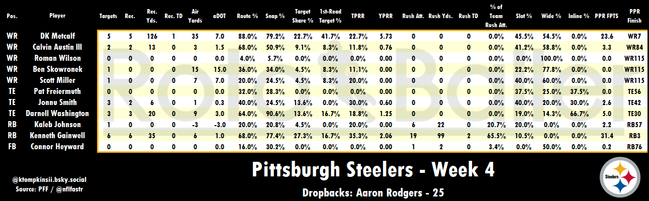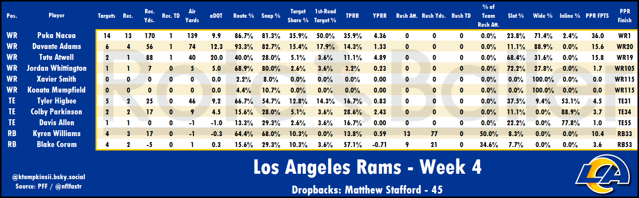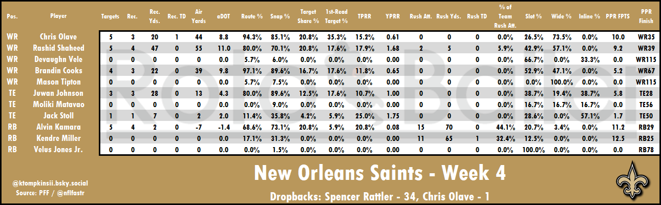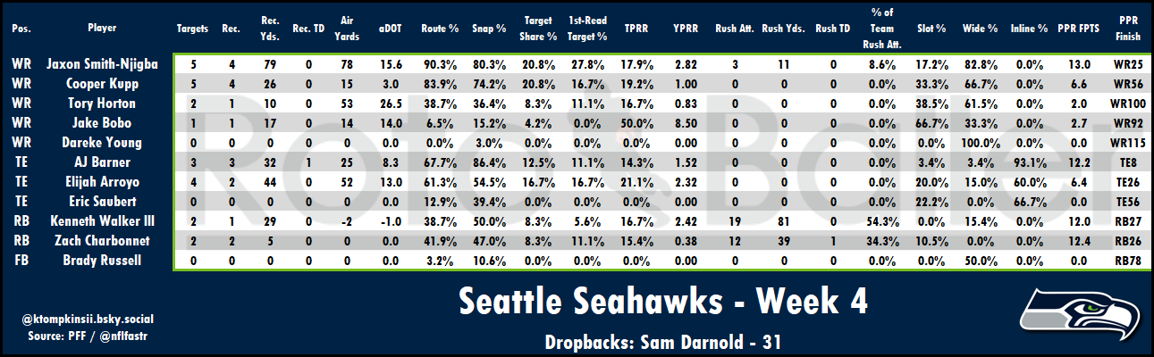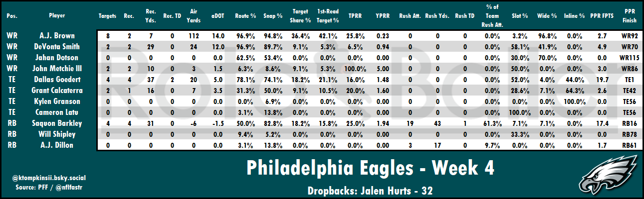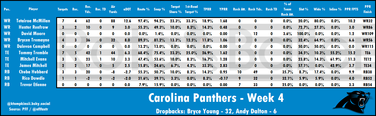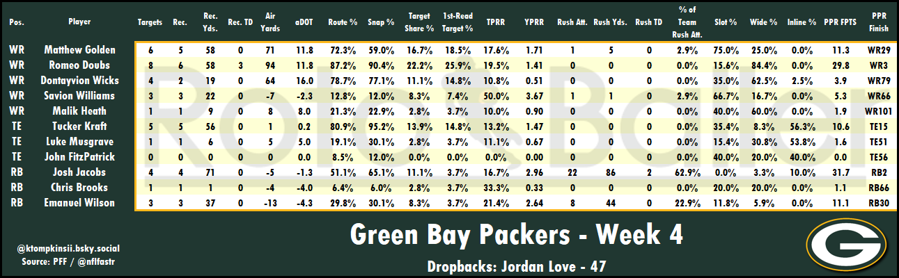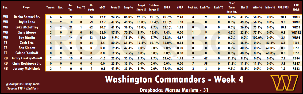 With a lot of the main players out here for the Commanders, including Jayden Daniels, there weren’t many viable starts for fantasy in Week 4 from this team. Still, Deebo Samuel Sr. was excellent with Terry McLaurin out, taking 94 percent of routes plus three carries on the ground too. No other Commander had more than two receptions, but seven others earned targets.