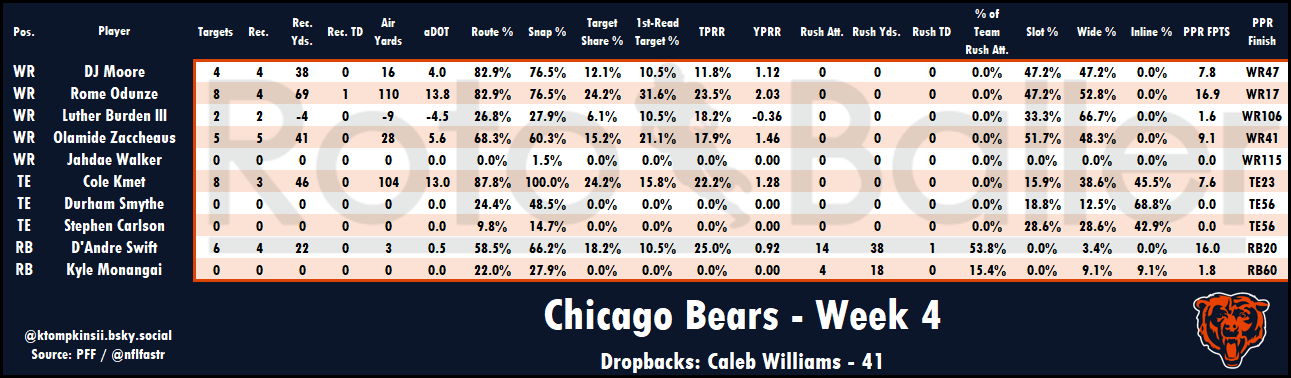 Rome Odunze (4-69-1) was solid here as he and Cole Kmet (3-46) tied for the team lead in targets with eight. Kmet got an extended run in this game with no Colston Loveland. Odunze scored Williams’ lone touchdown and was by far the most consistently productive receiver here for the Bears. Luther Burden III’s routes stayed stagnant at 27 percent as Olamide Zaccheaus (5-41) just HAS to get on the field on 68 percent of dropbacks. DJ Moore (4-38) was present and accounted for.
