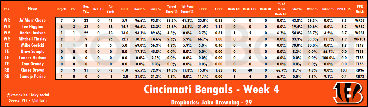 Chase Brown will still take a huge share of the team rushing attempts each week, and he may turn in some decently useful fantasy production in most weeks. He’s pretty good, and volume is king, as they say. 71 total yards and three receptions were the tally in Week 4, but without the threat of the passing game we’ve known and grown accustomed to, the floor and ceiling are smushed together.