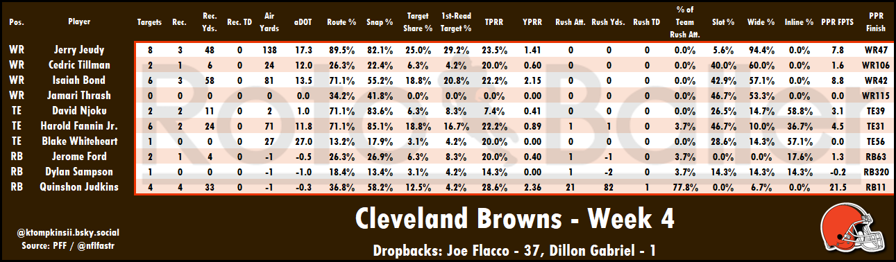 Cedric Tillman hurt his hamstring and left early in this game, so Isaiah Bond saw a season-high in routes per dropback to varying degrees of success. With Tillman placed on IR on Wednesday morning, that’s going to allow Bond to get more routes, and with the quarterback change from Joe Flacco to Dillon Gabriel for Week 5 in London, we’ll see if it produces any tangible change.