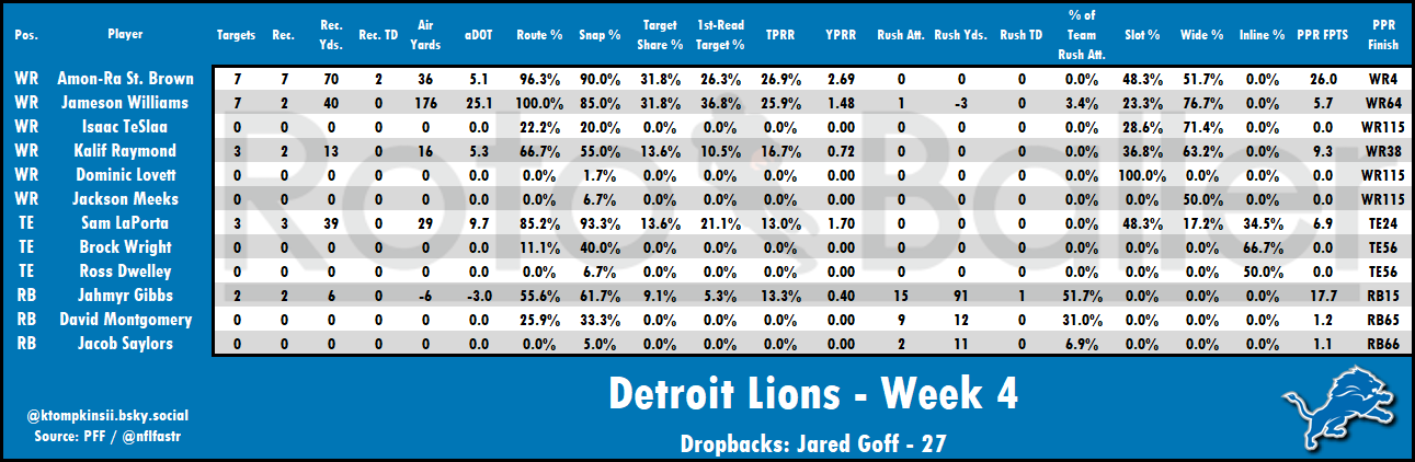 Bless ‘em, they’re definitely trying with Jameson Williams. A massive 25.1-yard aDOT this week for Williams and just two catches on seven targets, including 176 air yards that led all pass-catchers in Week 4. There’s no reason to ever get away from Williams as a fantasy play, as variance means those plays are going to hit massively for his managers.