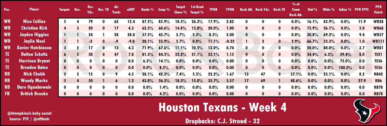 In the running game, we got Woody Marks passing the stationary Nick Chubb ship in the night, where Marks blew by him with 119 total yards and two touchdowns, showing the juice that has been missing in this offense since Tank Dell (we miss you, king!) was healthy. Marks ran more routes than Chubb (44 percent to 28 percent) and took more snaps (56 percent to 42 percent) as well. It was dominant, and we must reframe our opinion.