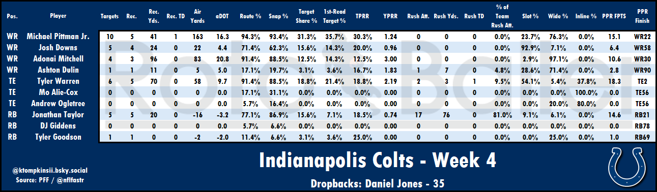 With no Alec Pierce due to injury, that gave a ton of time to Adonai Mitchell to get on the field with 91 percent of routes per Daniel Jones’ dropbacks. Mitchell had a nice game (3-96 on four targets) if you didn’t look at the fumble column and wonder what happened.