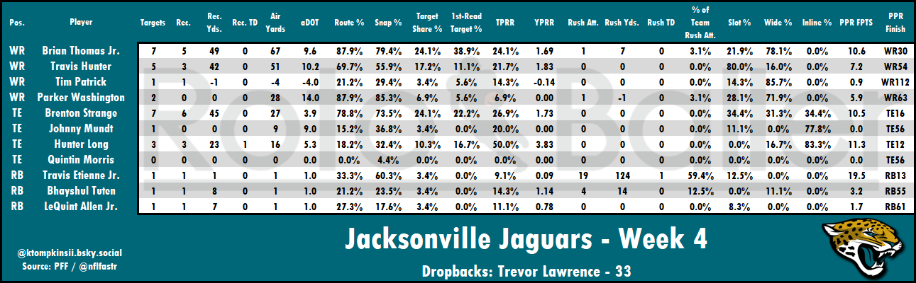 A few interesting notes about the Jaguars in Week 4, as Brian Thomas Jr. (5-49, tied for team lead with seven targets) looked a bit better than he has at most points this season. No doubt it’s been very frustrating as a fantasy manager for Thomas, but it’s been an incremental improvement based on the eye test. Travis Hunter (3-42) played MUCH less on defense with only nine snaps attributed to him in Week 4. Hunter had a three-week high in routes in Week 4 with 70 percent of routes per Trevor Lawrence’s dropbacks. Baby steps, it seems.