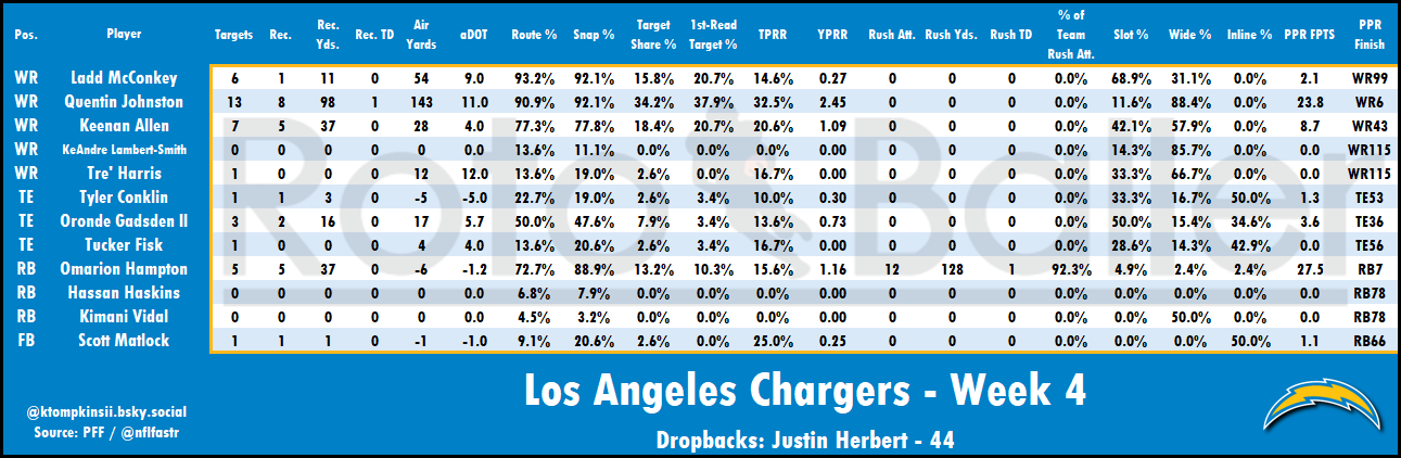The Chargers had 44 dropbacks and just 13 team rush attempts, with Omarion Hampton (12-128-1 rushing; 5-37 receiving) getting 12 of those attempts. He was awesome here with this massive role sans Najee Harris.