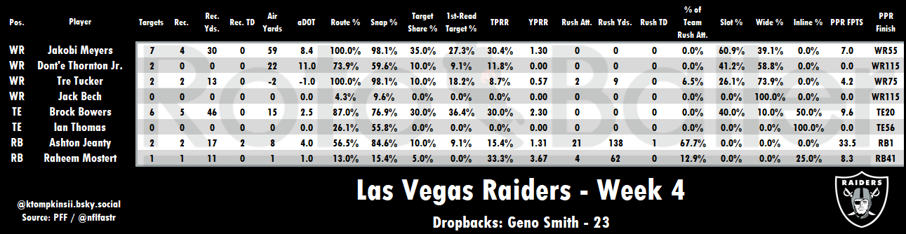 Geno Smith only threw for 117 yards on just 21 pass attempts, so muted days from Jakobi Meyers (4-30 on seven targets) and Brock Bowers (5-46 on six targets). No other Raider had more than two targets or two receptions. This game from Tre Tucker (2-13, two targets; 2-9 rushing; 100% routes) was more of what we can expect from him in most weeks, not as much the three-touchdown outburst from Week 3.