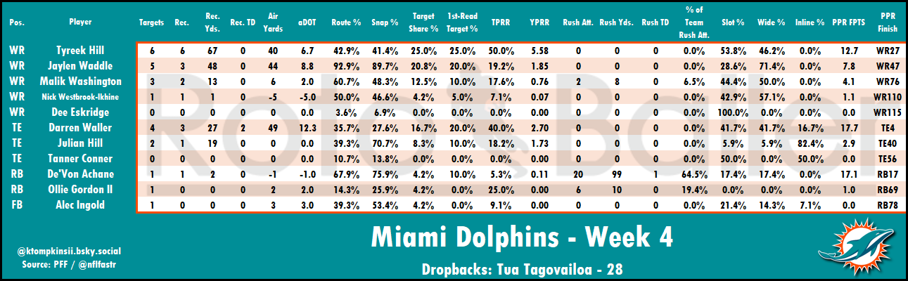 As we know, the Dolphins are a very condensed offense in terms of production, and that was primarily through Hill, Jaylen Waddle, and De'Von Achane. Waddle and Achane obviously remain, but several things could happen here going forward with Miami’s target distribution: