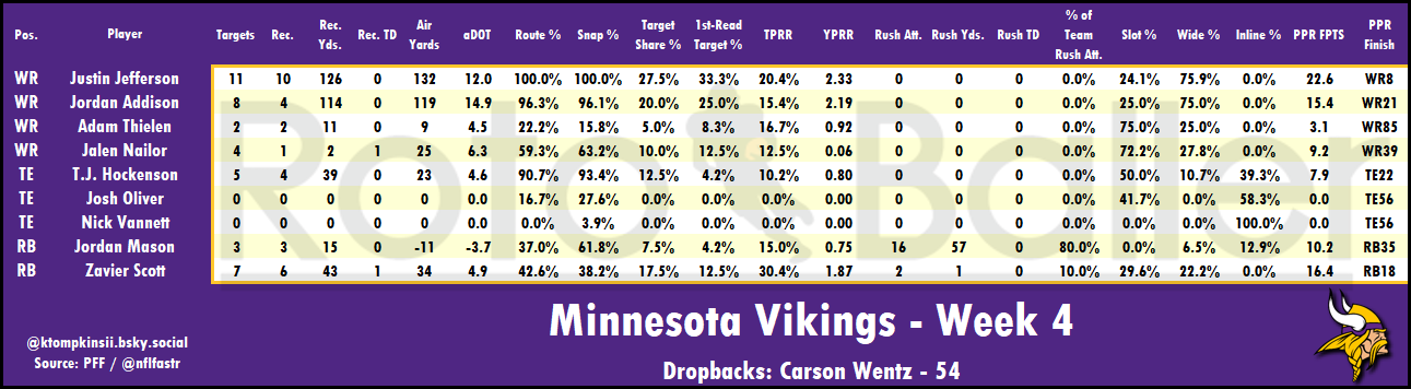 Both Jefferson (10-126; team-leading 11 targets) and Addison (4-114; 8 targets) consolidated the target volume here for the receivers, combining for almost half of the Vikings’ targets and most of the yardage. Jefferson had 100 percent route participation, and Addison was not far off that with 96 percent routes, so the boys are back in town here.