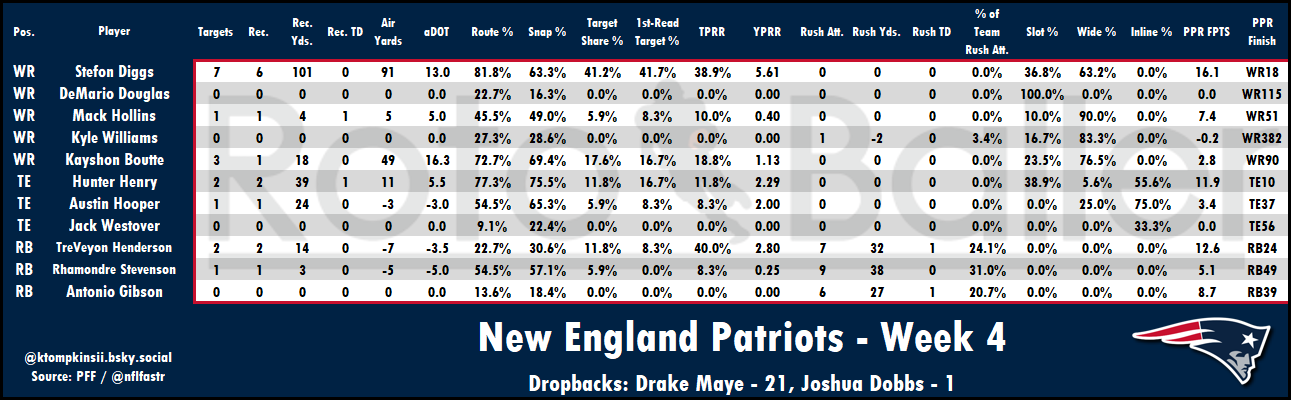 Stefon Diggs reemerged as a worthy target for Maye with his best game of the season, a 6-101 performance on a resurgent 82 percent of routes. The other four receivers combined for just four targets, two catches, and 22 yards. Though Mack Hollins did get a touchdown, so there’s that. Hunter Henry also continued his solid play with a touchdown on top of a 2-39 afternoon.