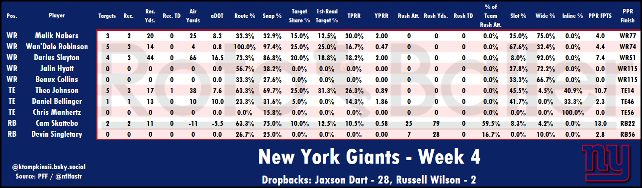 Skattebo is going to have to be a massive focal point here, but perhaps he and Dart can play some two-man rushing stuff to keep defenses on their toes. The Giants will have to get creative, for sure. Skattebo’s role was massive, though, with 27 touches, 60 percent of the team’s rushing attempts, and 63 percent of routes per dropback.