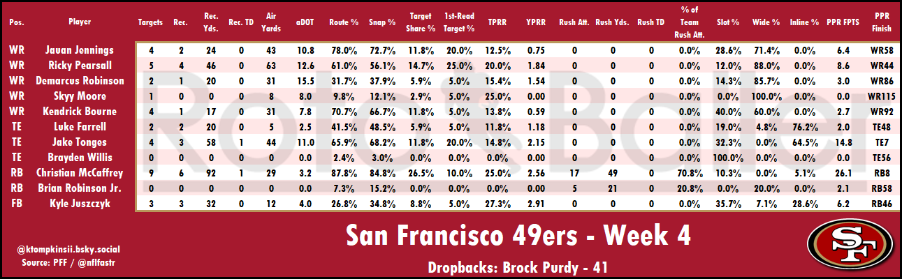 It’s truly a war of attrition for these San Francisco 49ers, as they can’t seem to either get people healthy or stay healthy. Ricky Pearsall (4-46; 61 percent of routes) left the game with a knee injury. Jauan Jennings (2-24) played 78 percent of routes, but didn’t contribute much. Quarterback Brock Purdy threw for over 300 yards, but turned the ball over three times as they gave this game away to the Jaguars for their first loss of the season. All three of Pearsall, Jennings, and Purdy won’t play in the short turnaround to Thursday Night Football.