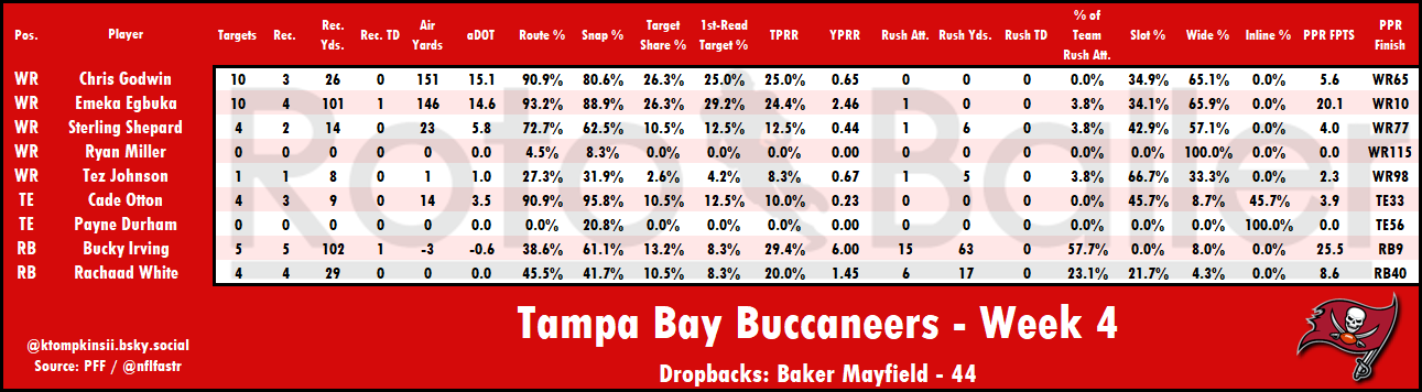No Mike Evans, but the Buccaneers DID get back Chris Godwin, and he immediately earned 10 targets and 151 air yards on 91 percent of routes. The production was obviously disappointing based on that intent from the offense, but better days are ahead. Emeka Egbuka matched Godwin’s 10 targets and was slightly more efficient, but caught a 77-yard touchdown to save the day. Egbuka is undeniable at this point, and when Evans comes back, it feels like Egbuka is just going to stay out there on the field to relegate Godwin to a lesser route share. It’s definitely fair to say that Egbuka is staking his claim and then some.