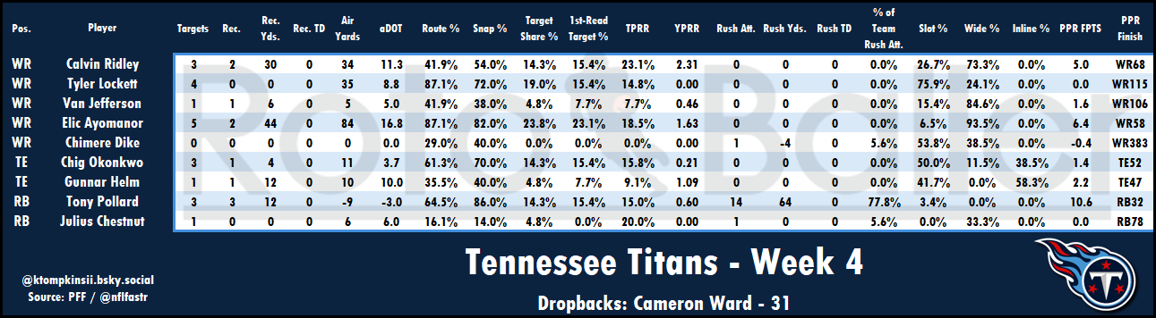 The Titans scored zero points, and only Tony Pollard had more than two receptions (3-12 receiving) and more than 44 total yards (14-64 rushing). It was bowling-shoe ugly. Calvin Ridley (2-30) saw just 42 percent of routes in a game in which he was healthy. This team is awful.