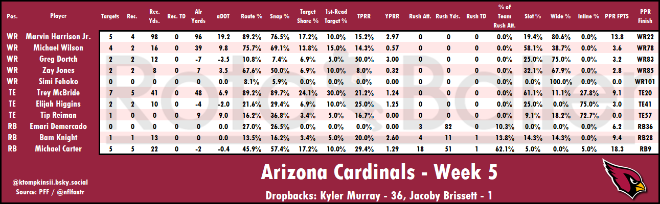 Trey McBride was just fine, earning a team-leading seven targets. No other wide receiver or tight end caught more than two receptions on the afternoon.