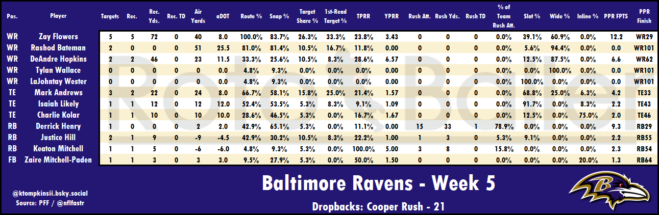 Under the Cooper Rush regime in Baltimore, the Ravens kind of (actually do) stink. I guess using “kind of” is my way of being democratic about it. Anyway, Rush stinks. They had just 20 pass attempts and 19 rushes. They barely ran any plays – just 40. Only Zay Flowers (5-72) and Mark Andrews (2-22) had more than two targets. Derrick Henry (13-33-1 rushing; one target) was game-scripted out of the game and scored the team’s only touchdown in the third quarter.