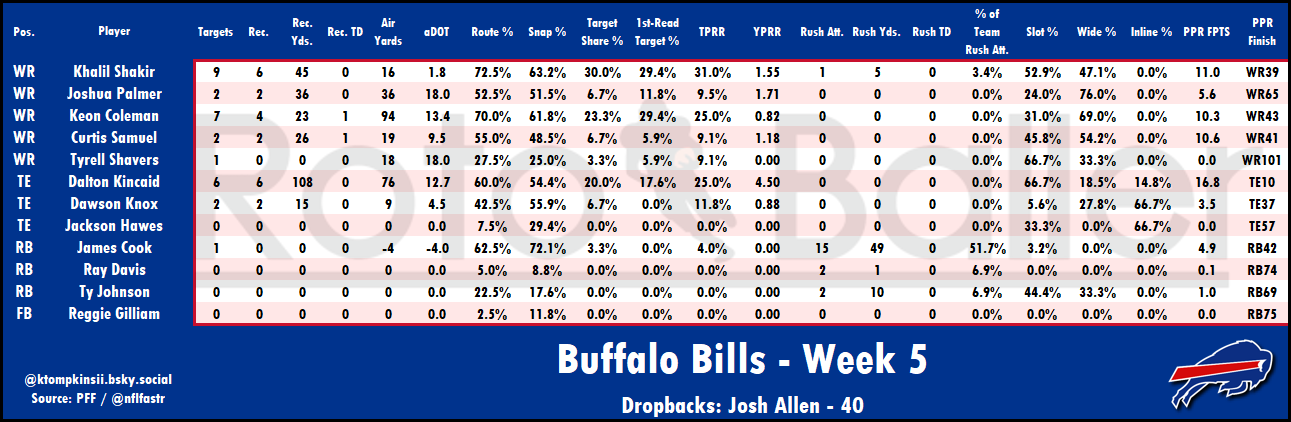 The Bills are who they are: a very spread-out offense in the passing game, where it’s hard to pinpoint who will be the top target weekly. Also spread out are the routes, where Khalil Shakir (6-45, team-leading nine targets) ran the most routes of any Bills pass-catcher in Week 5, but at just 73 percent. Coleman (4-23-1) and Curtis Samuel (2-26-1) caught Allen’s touchdown passes, and Dalton Kincaid paced the production with the first 100-yard game of his career on just 60 percent of routes.
