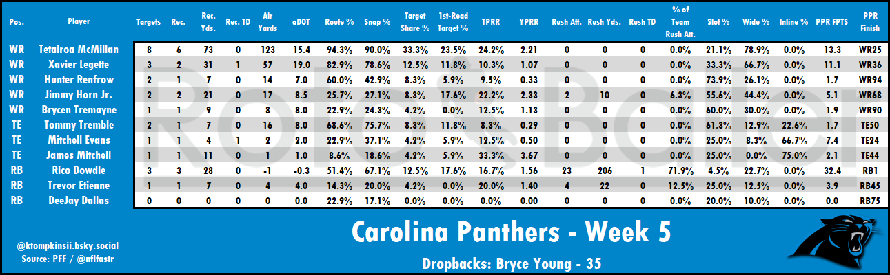 In the passing game, no pass-catcher had more than three targets other than Tetairoa McMillan, who, despite subpar quarterback play, continues to be the clear top target. When the quarterback play improves, we’re looking at a fringe WR1. It’s possible that Jalen Coker could return for his first game action of 2025, so he could potentially change the complexion of this passing game. Coker is definitely somebody to keep an eye on for fantasy purposes.