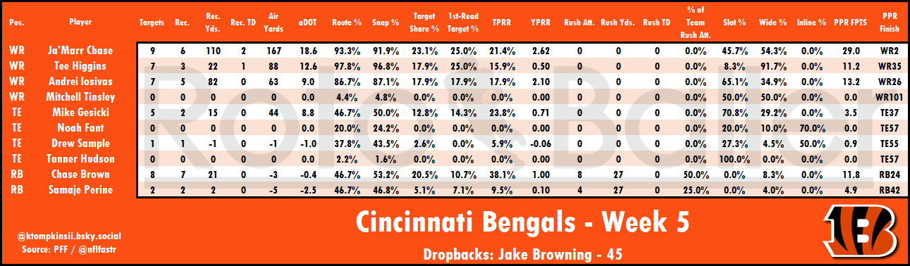 Ja'Marr Chase’s game (6-110-2) is proof positive of why you don’t get cute with your fantasy lineups and sit a player like Chase or Tee Higgins (3-22-1), who combined for three touchdowns and over 40 percent of the team’s targets. These are still professional football teams, and even with Browning playing completely awful, they can still put points up when the Lions give little to no resistance.
