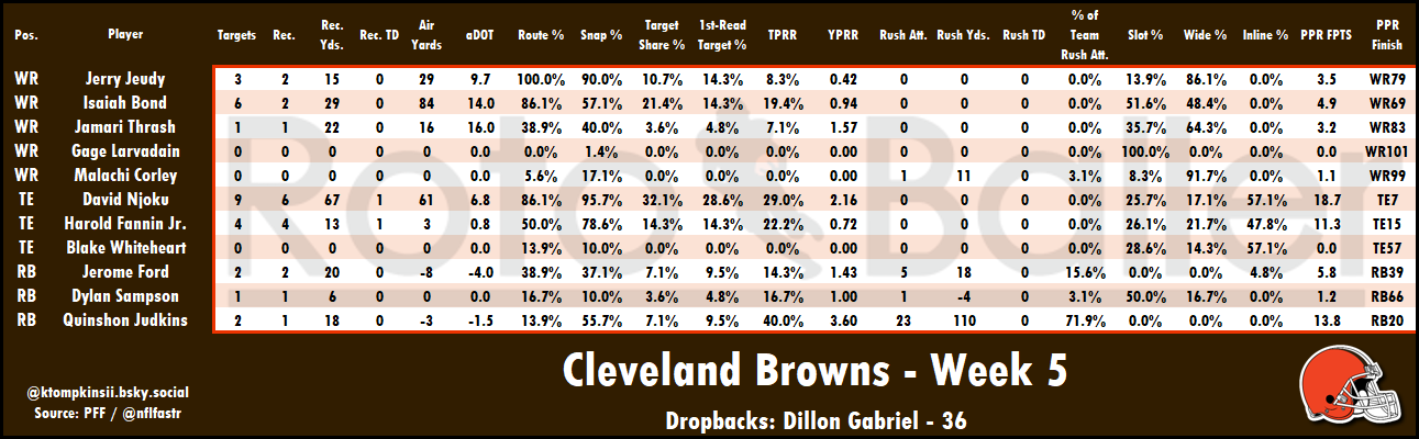 13 of his targets went to the tight ends, as he resurrected David Njoku (6-67-1, team-leading nine targets) from the brink so he could post by far his best stat line of the season. Even Harold Fannin Jr. (4-13-1) caught a touchdown as well, but on far less production. No other pass-catcher caught more than two balls, and that includes Jerry Jeudy (2-15), who had 100 percent route participation, and Isaiah Bond (2-29), who stepped into Cedric Tillman’s role.