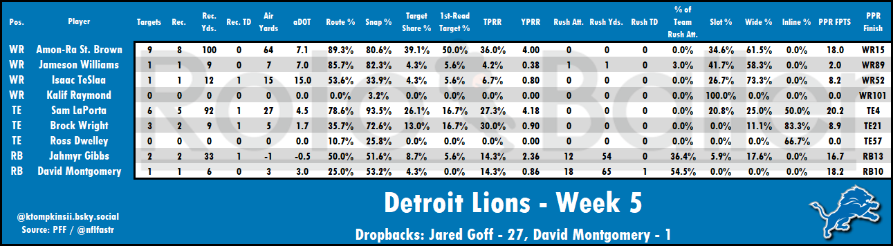 The Lions got up big time, up 28-3 heading into the fourth, when they took the foot off the gas. Amon-Ra St. Brown quietly put up another 100-yard game. Sam LaPorta bounced back from a string of disappointing games to post his best line this season. Jameson Williams (1-9) is clearly struggling right now, with just five receptions in his last three games combined. We know what we can do; it’s just the low end of variance right now.