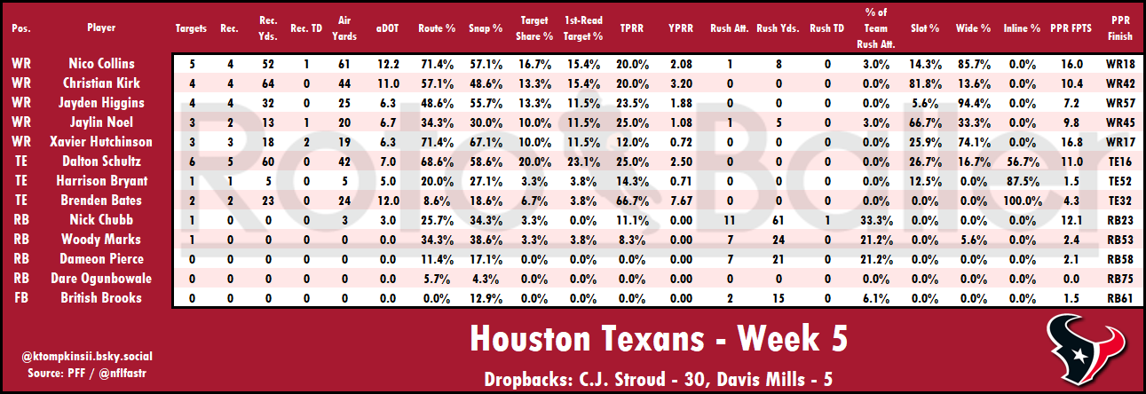 Lots of fantasy managers added Woody Marks (7-24 rushing; one target) last week, and then lo and behold, the Texans still wanted to get Nick Chubb (11-61-1 rushing; one target) plenty of involvement. It's a little bit scary that the Texans still want to get Chubb on the field so much, considering he barely has one working knee ligament. So, I'm a little bit skeptical that Houston knows what running back to get on the field when they don't even know what wide receivers they want to get on the field.